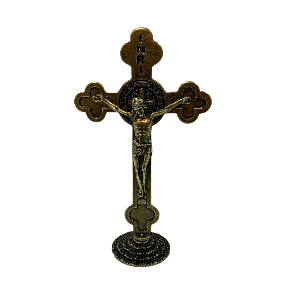*Crucifixo de Mesa Metal Ouro Velho São Bento - 22,5x14cm.