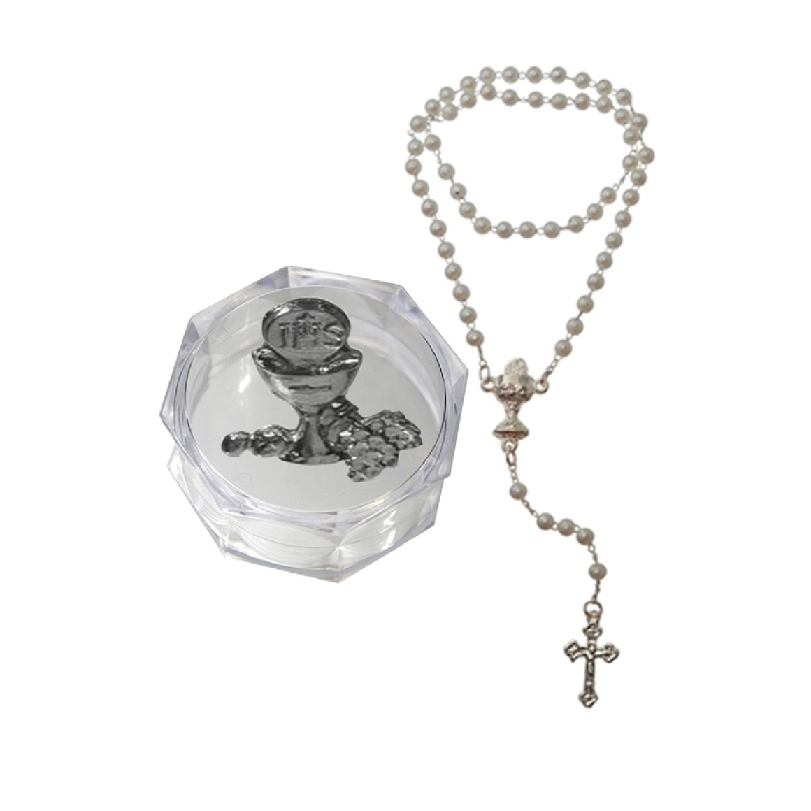 *Caixa de Acrílico Sextavada c/ Medalha e Terço de Pérola n°4 Primeira Eucaristia - 3,5X3,5cm.