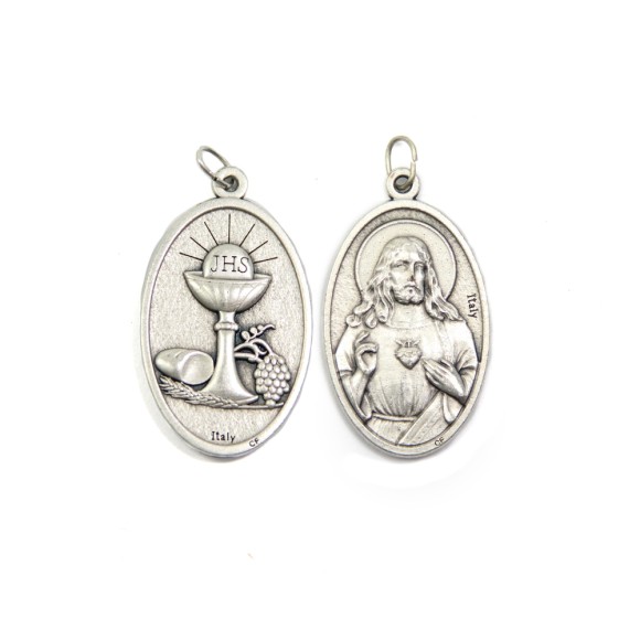 MD112095 - Medalha Primeira Eucaristia Sagrado Coração de Jesus Italiana Oval Dupla - 4,5x2,6cm
